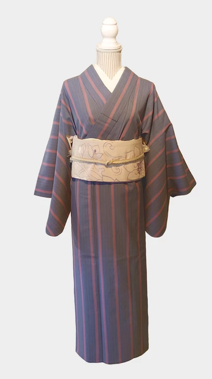 ピンクのストライプの模様がブルー地に生えてさわやかなお着物です。