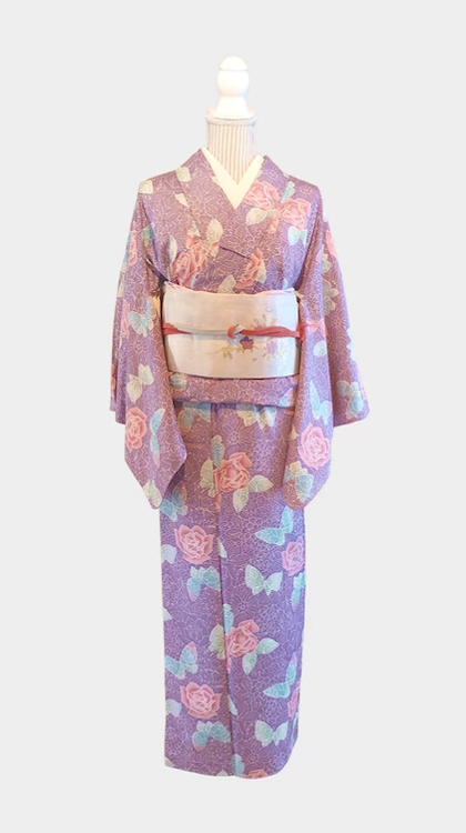紫に近いピンクが入っており花模様もバラがあしらわれ非常に華やかなお着物です。