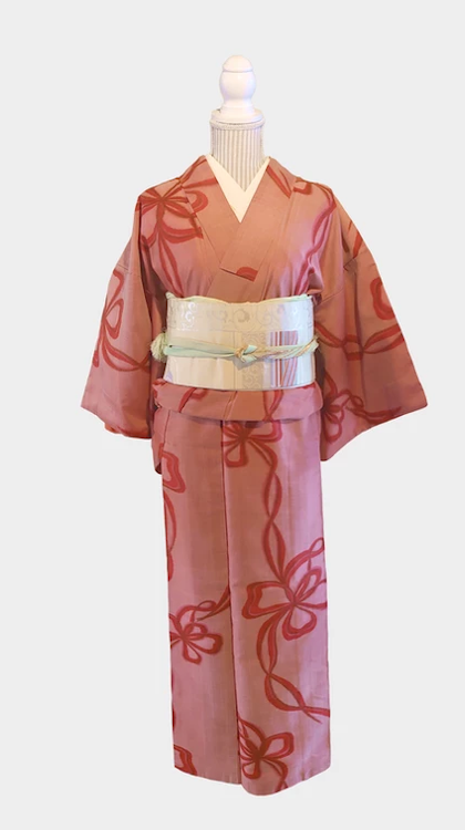 少し光沢のある生地で薄い赤に曲線で入るリボン柄がかわいらしいお着物です。