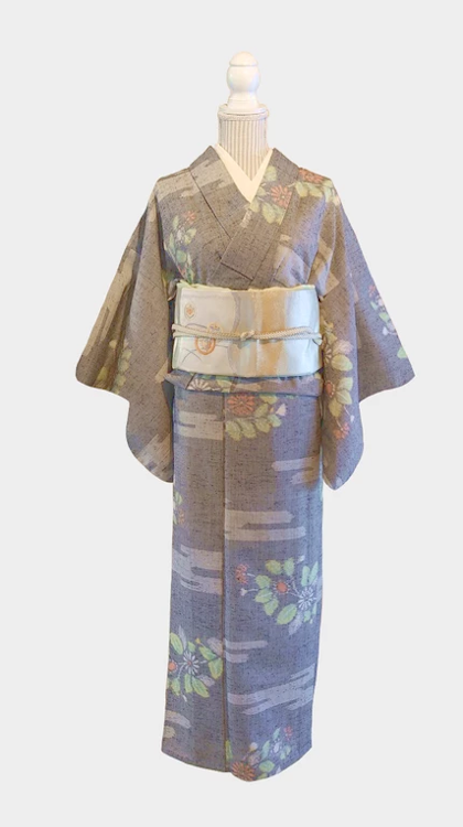 グレーの紬で春や秋に来ていただけます。睡蓮の模様がさわやかな置物です。