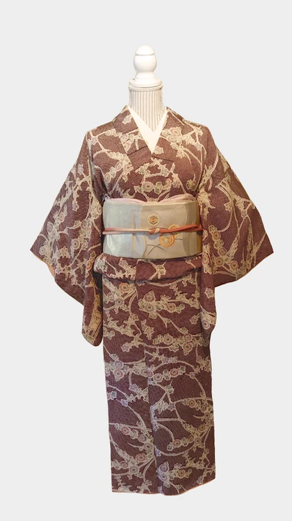 全体に模様が入っていて華やかなお着物ですがえんじに近いお色味が上品です。