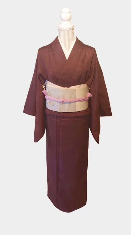 シックな着物ですが生地の光沢が高級感をただよわせています。非常に綺麗な赤紫のお着物です。